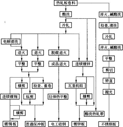 冷轧板带的轧制方法虽有单张和成卷、单机座和多机座之分,但它们的生产工艺过程却基本相似。冷轧薄板、带钢中有3大典型产品:镀层板、汽车板与电工硅钢板。其生产工艺流程大致如下图所示。