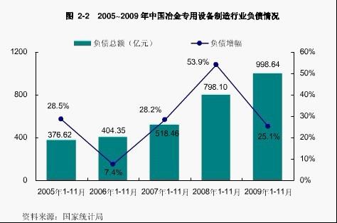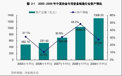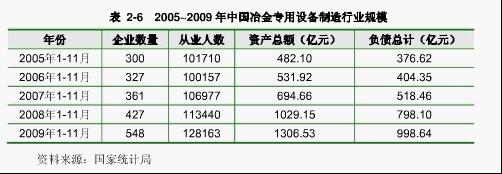 2009年,中国冶金设备制造行业规模继续保持增长。截至2009的11月,中国冶金专用设备制造业规模以上企业达到548家,同比增长28.34%;从业人员数量12.82万人,同比增长12.98%;行业资产总额达到1306.53亿元,同比增长26.95%,行业总体规模进一步扩大;负债总额达到998364亿元,同比增长25.13%。