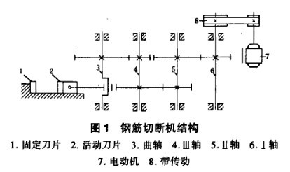 常用钢筋切断机的结构如下图所款,即电动机通过甲等带传动、三级齿轮传动,驱动曲柄滑块机构,带动活动刀座往复运动,固定在活动刀座上的活动刀片与固家在机体上固定刀片一道作用,完成对钢筋的切断。