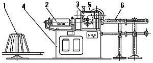 钢筋调直切断机结构图:1为盘料架、2为调直筒、3为调直机构、 4为机座、5为剪切机构、6为受料架